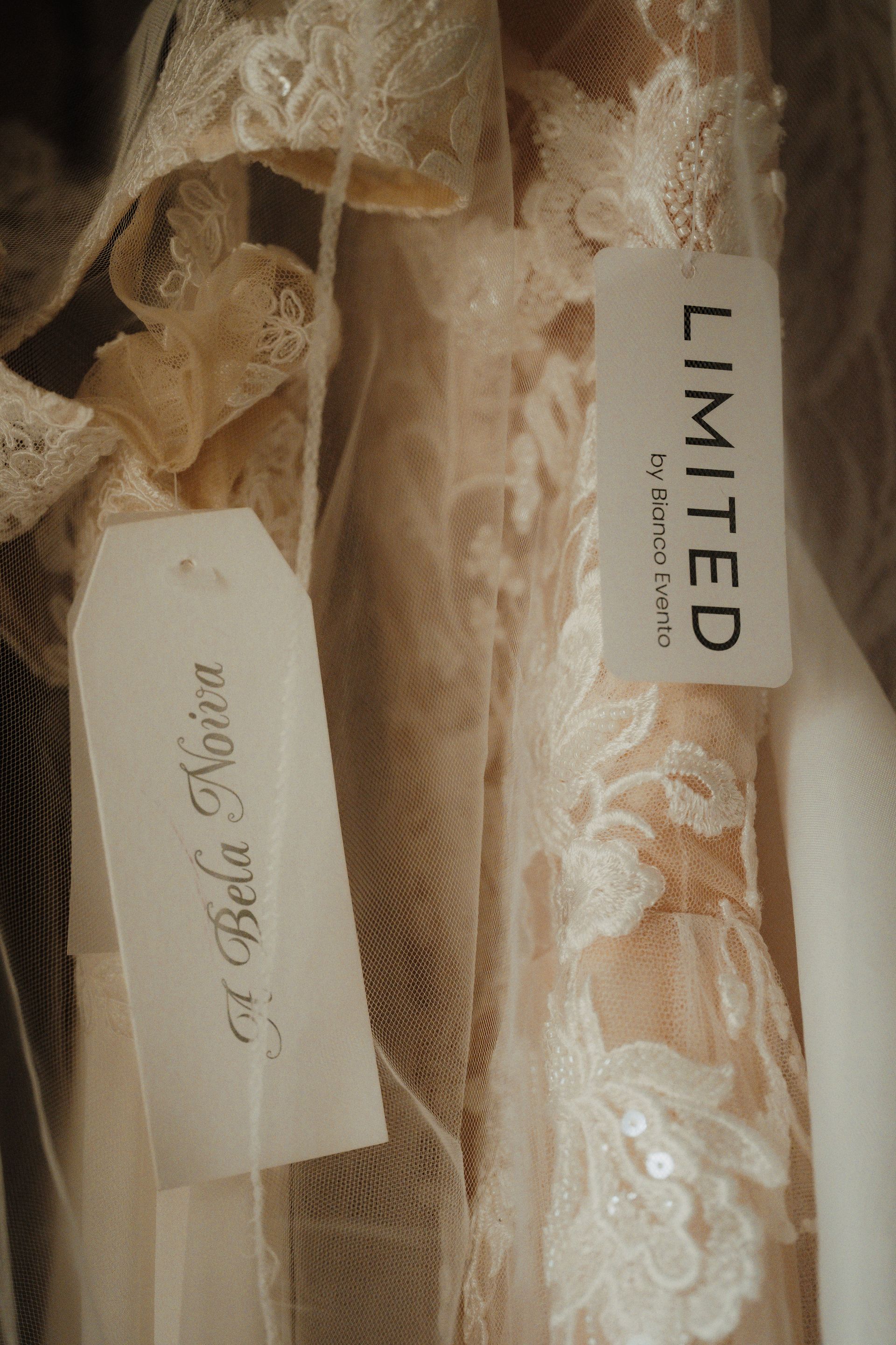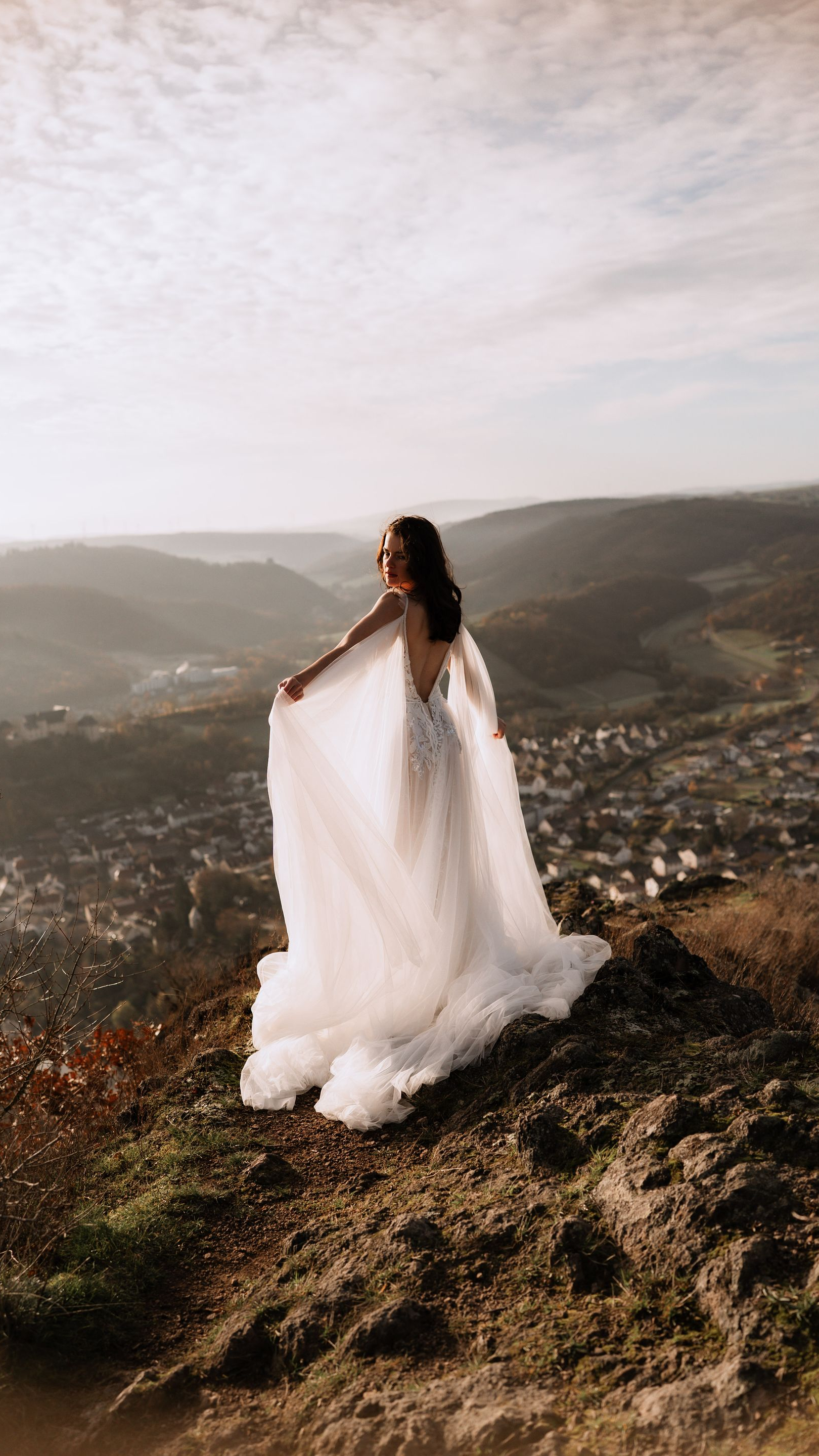 purer Magie. Zarte, kunstvolle Spitze verschmilzt mit fließendem Tüll zu einer Silhouette, die wirkt, als würde sie schweben. Die transparenten Details schmeicheln der Figur, ohne aufdringlich zu sein, und der tiefe Rückenausschnitt verleiht dem Kleid eine