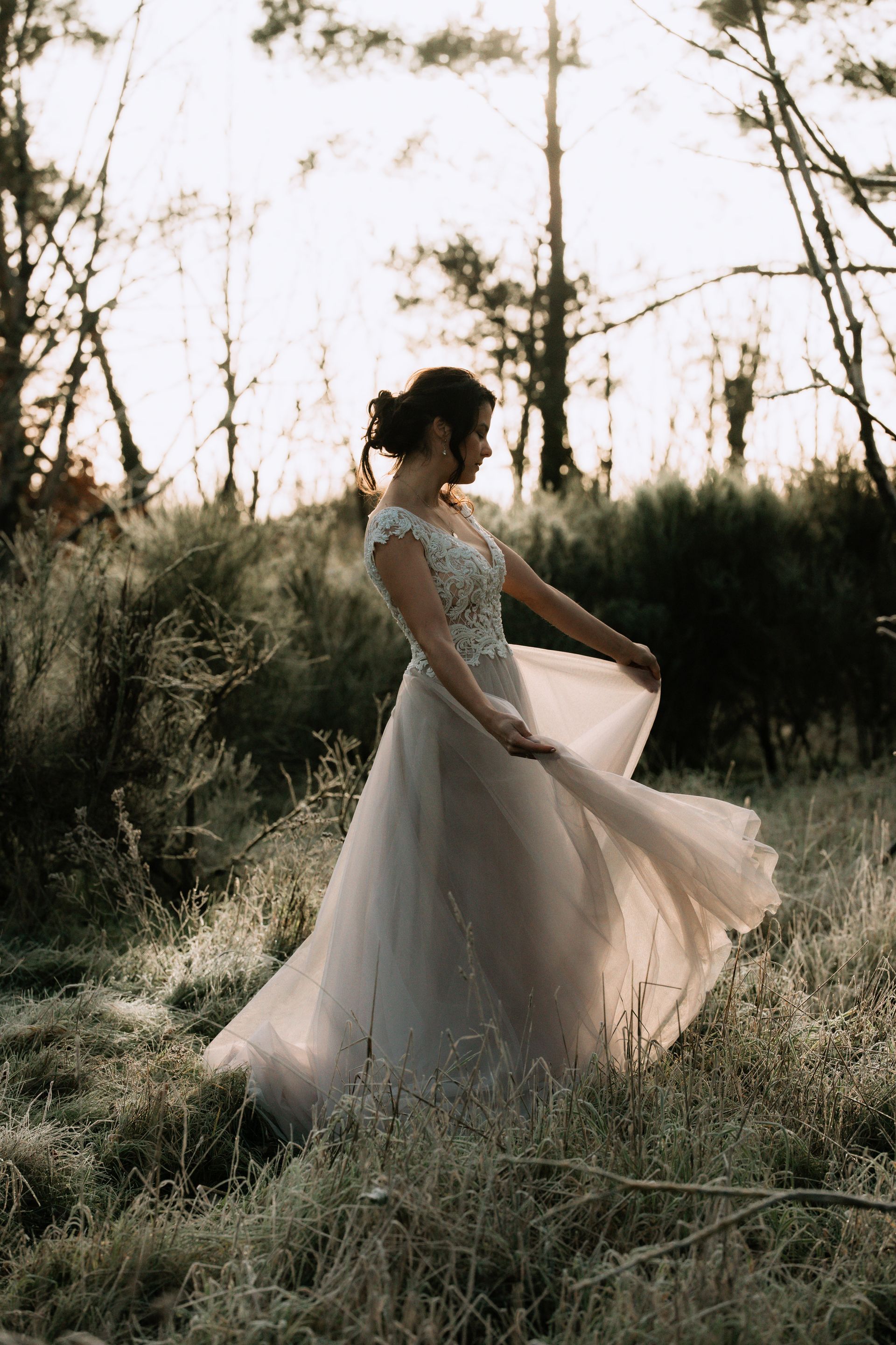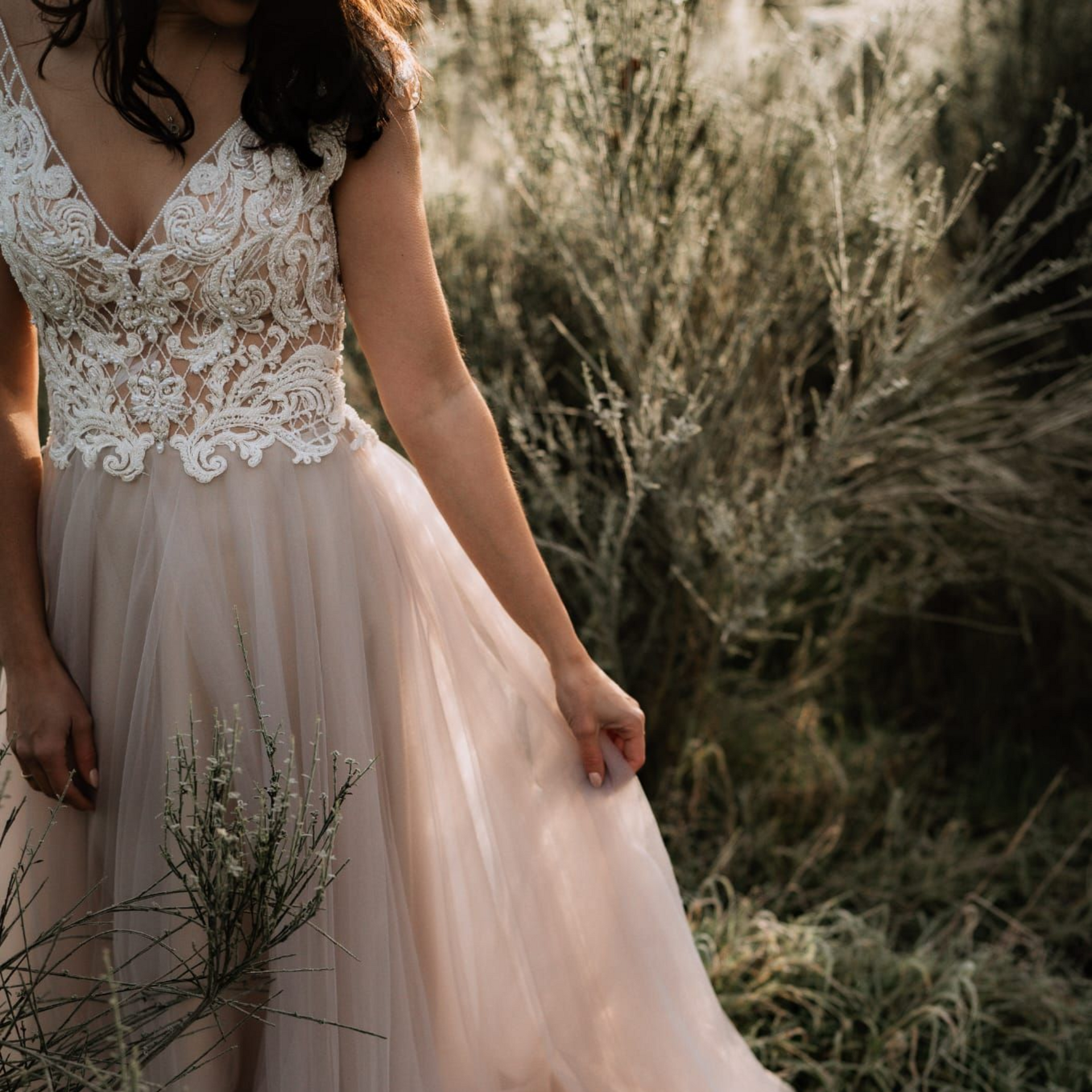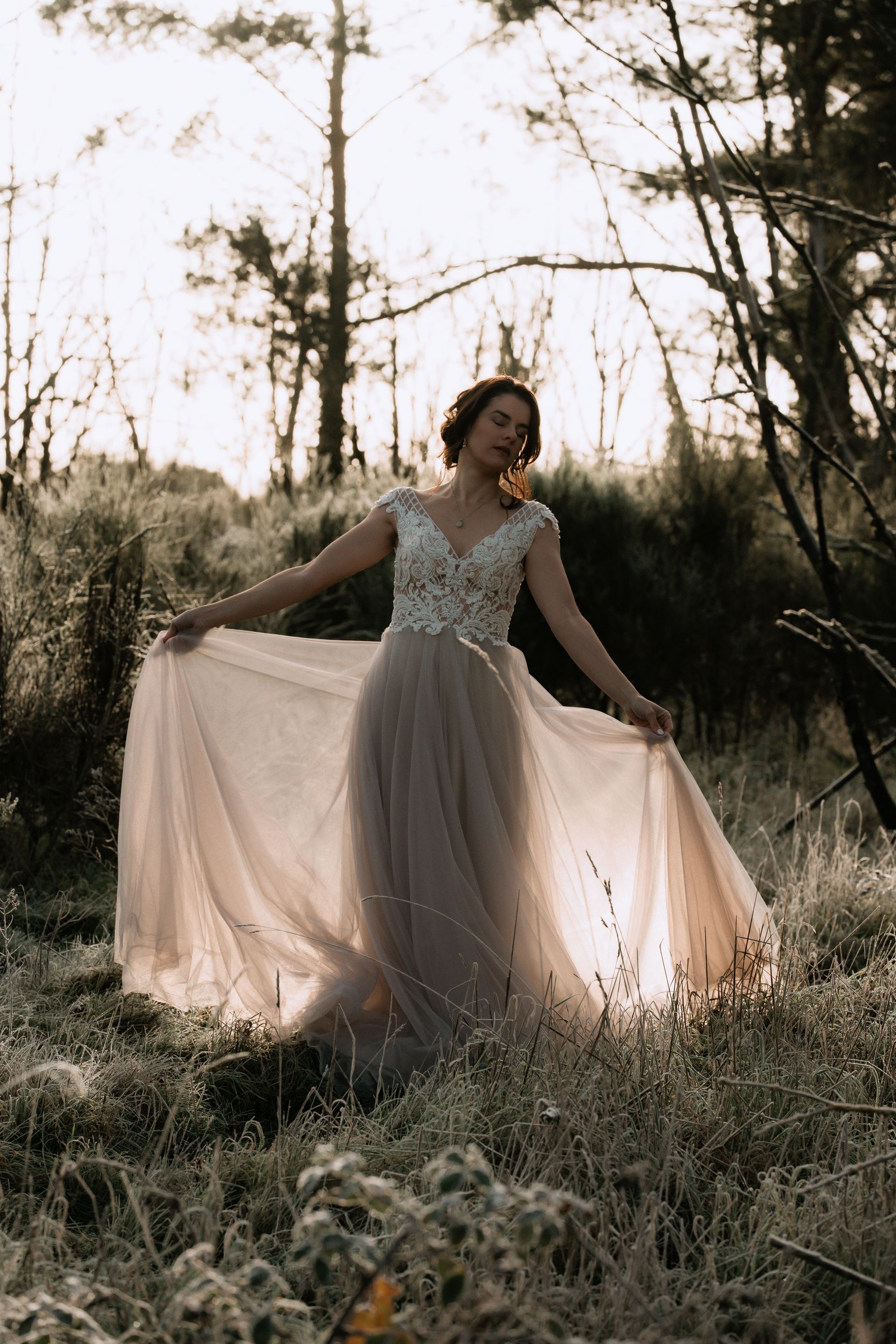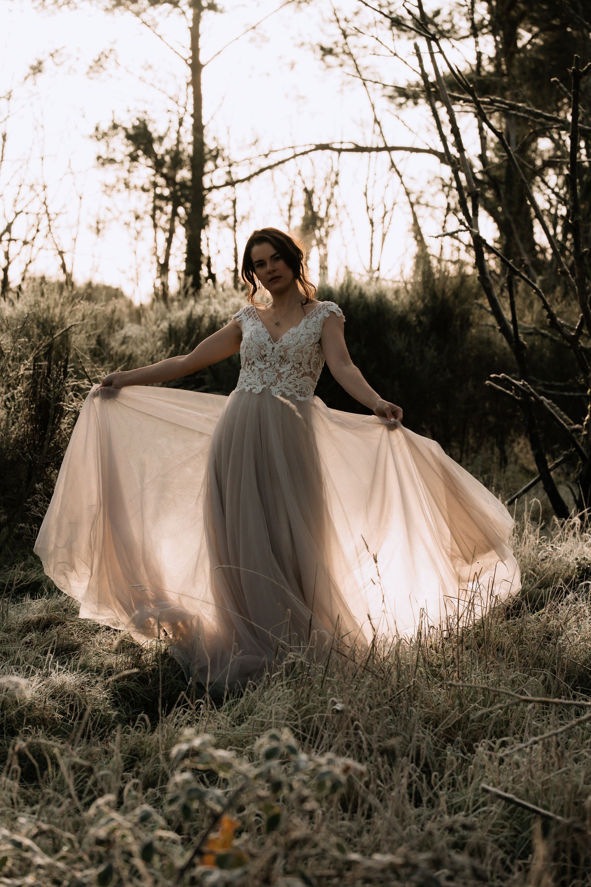mit zeitgemäßer Eleganz. Das filigrane Perlenoberteil wirkt wie handgezeichnete Poesie auf der Haut, während der sanft schimmernde Tüllrock jede Bewegung in ein fließendes Kunstwerk verwandelt. Inmitten der Natur entfaltet das Kleid seine ganze Magie – es tanzt, es schwebt, es erzählt eine Geschichte von Freiheit, Liebe und einem