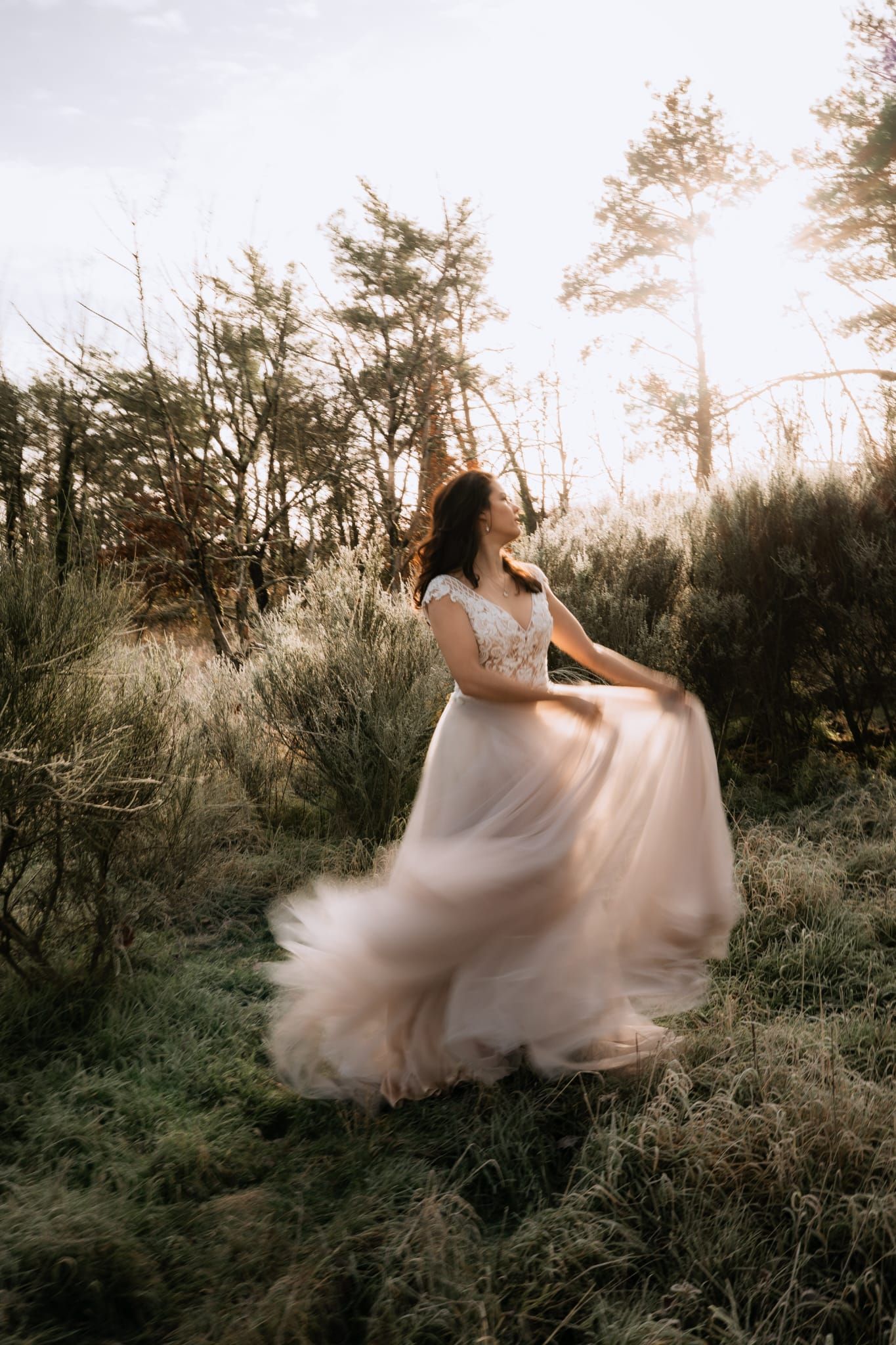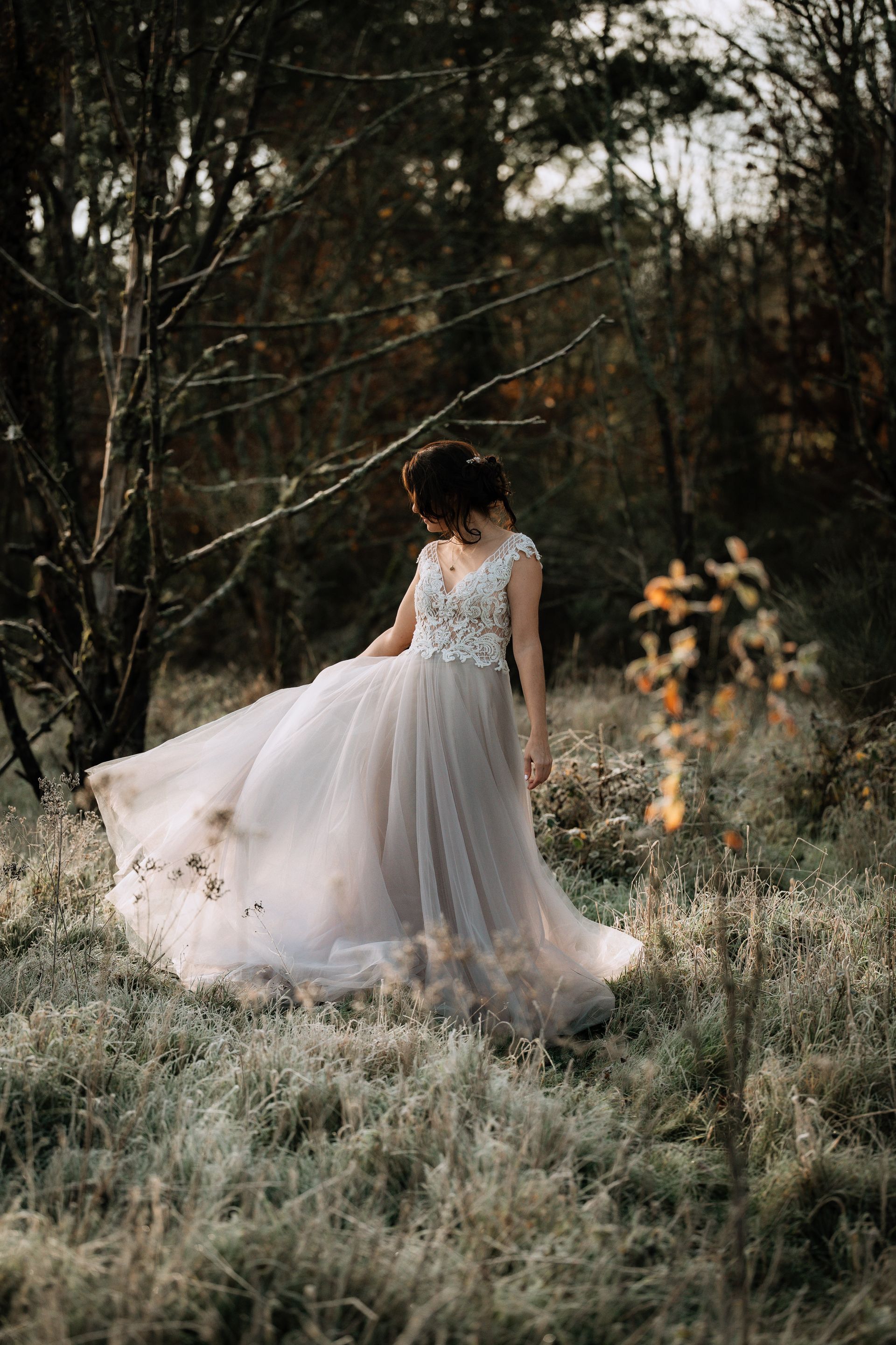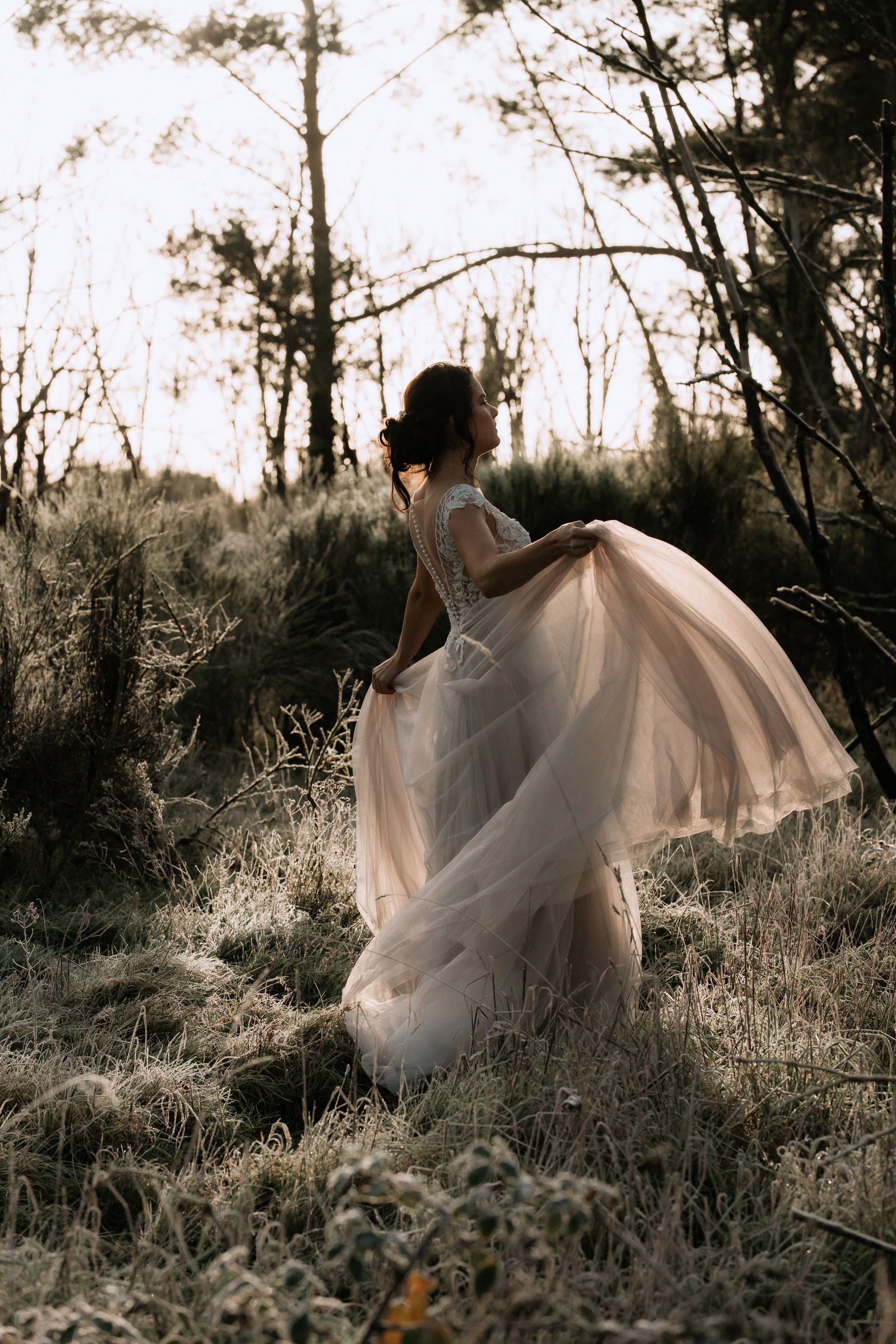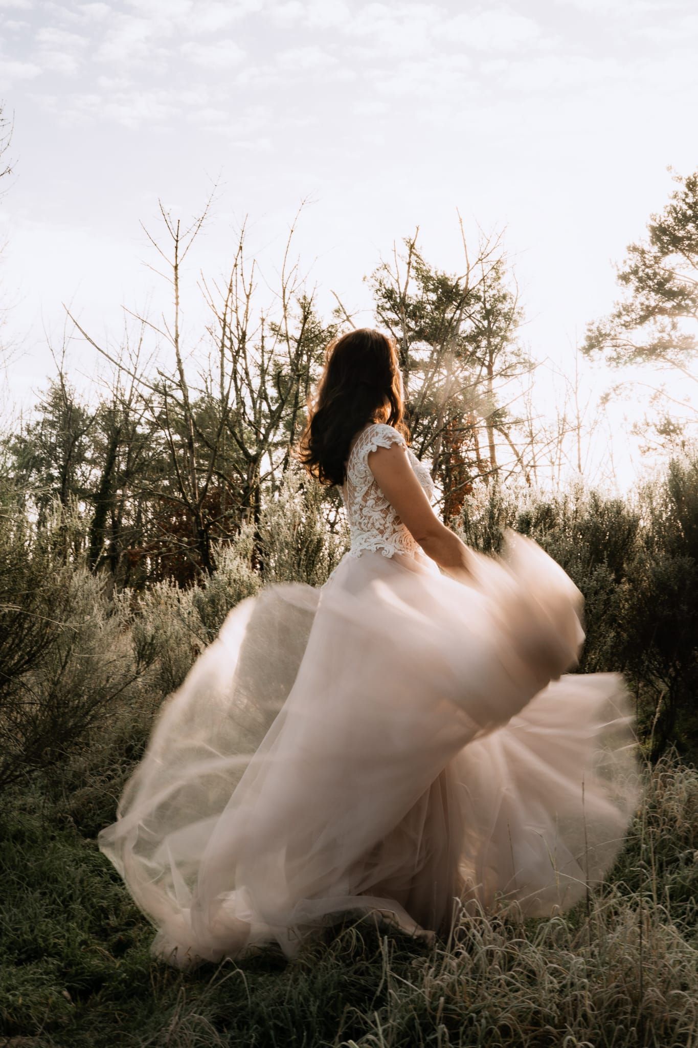 mit zeitgemäßer Eleganz. Das filigrane Perlenoberteil wirkt wie handgezeichnete Poesie auf der Haut, während der sanft schimmernde Tüllrock jede Bewegung in ein fließendes Kunstwerk verwandelt. Inmitten der Natur entfaltet das Kleid seine ganze Magie – es tanzt, es schwebt, es erzählt eine Geschichte von Freiheit, Liebe und einem